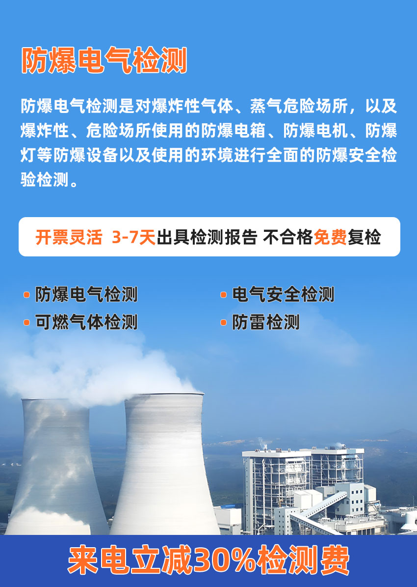 防爆電氣檢測是對爆炸性氣體、蒸氣危險場所,以及爆炸性、可燃性粉塵危險場所使用的防爆電箱、防爆電機、防爆燈等防爆設備以及使用的環境進行全面的防爆安全檢驗檢測。
